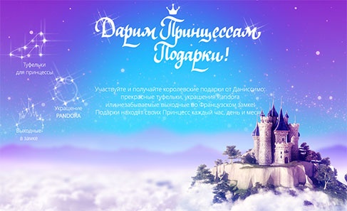 Участвуйте и получайте королевские подарки от Даниссимо: прекрасные туфельки, украшения Pandora или незабываемые выходные во Французском замке! Подарки находят своих Принцесс каждый час, день и месяц.