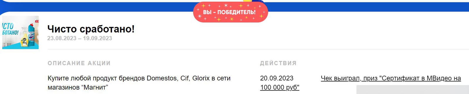 Покупайте продукцию Domestos, Cif, Glorix в магазинах «Магнит», регистрируйте чек и участвуйте в розыгрыше призов.