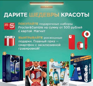Покупайте подарочные наборы Procter & Gamble на сумму от 500 рублей с картой Магнит. Выигрывайте роскошные подарки. Главный приз - смартфон с экслюзивной гравировкой.