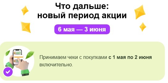 На почту пришло: "Принимаем чеки с покупками с 1 мая по 2 июня включительно."