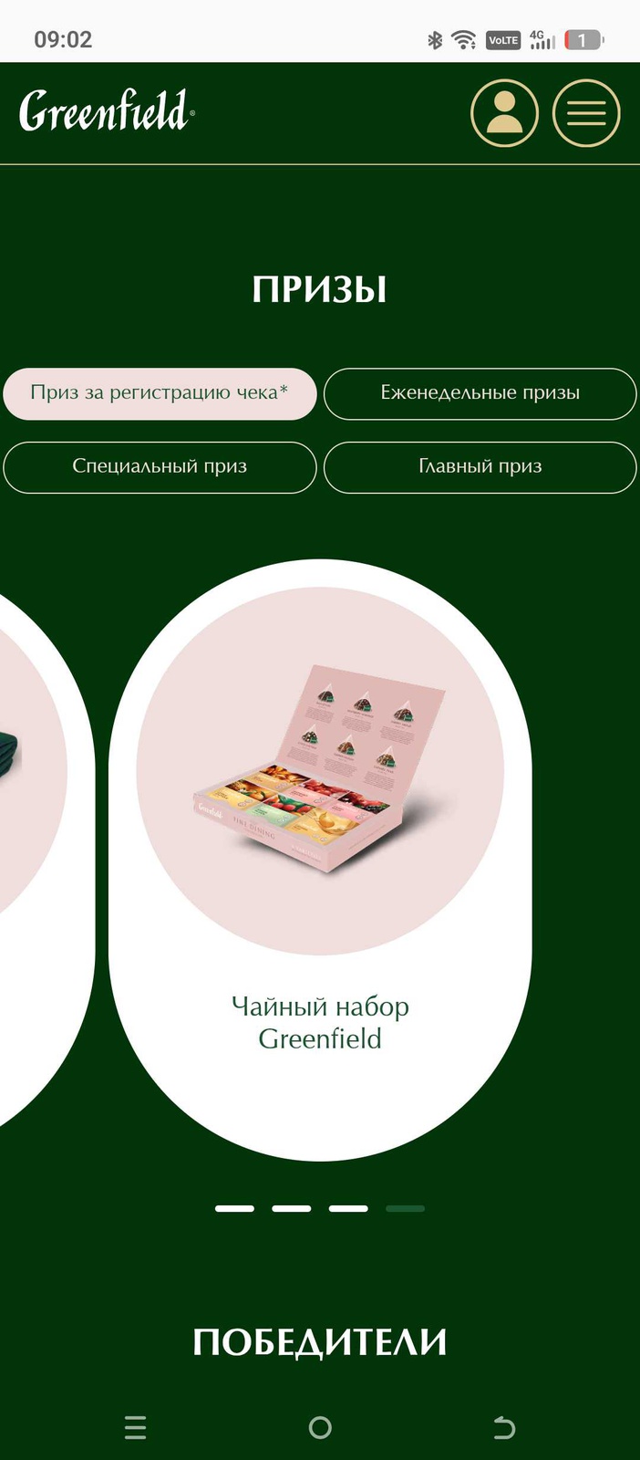 Для участия в розыгрыше Специального приза необходимо зарегистрировать не менее 4 (четырех) валидных чеков с чаем Greenfield, купленным в Торговой сети «Пятёрочка».