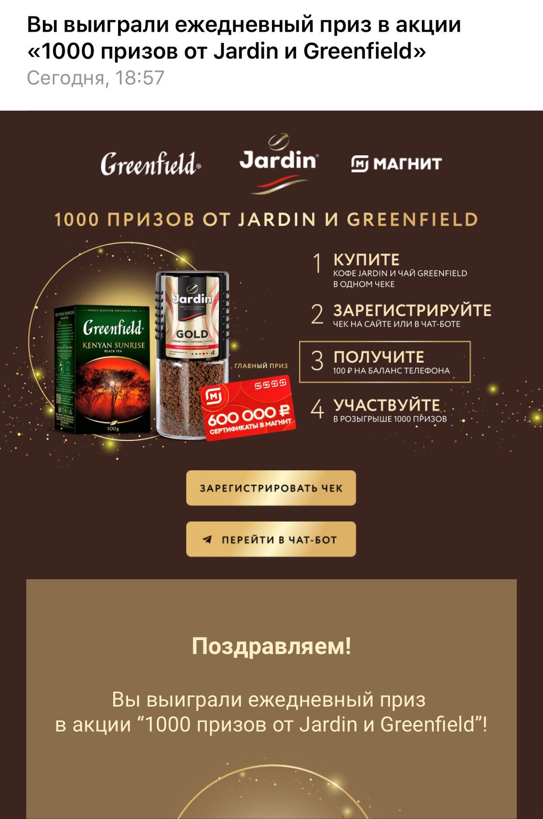 С 26 июля 2023 года участвуйте в акции от Greenfield и Jardin в магазинах «Магнит». Покупайте продукцию, участвующую в акции, регистрируйте чек и выигрывайте подарочные сертификаты и другие призы.