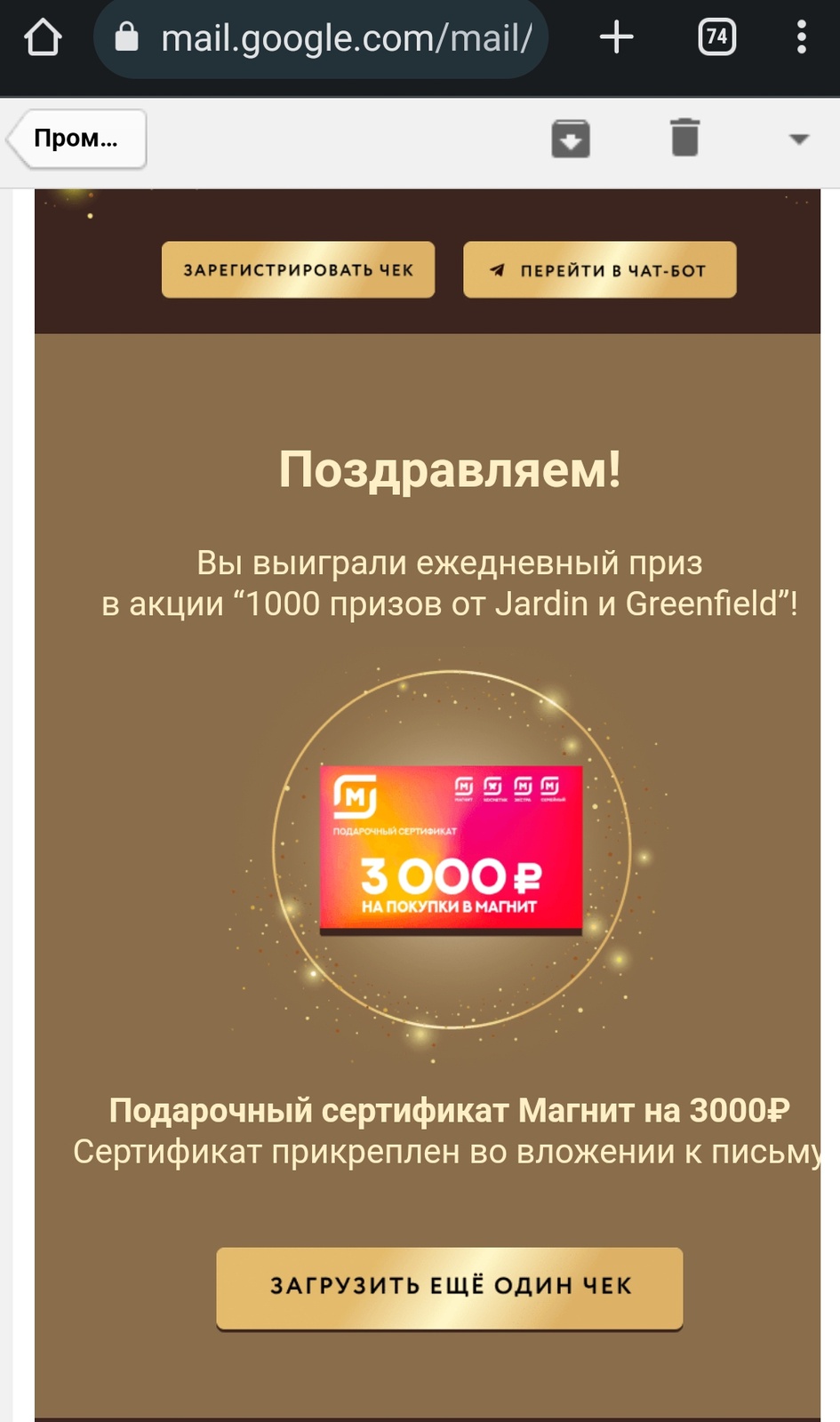 - Зарегистрируйте чек на сайте или в чат-боте телеграм @greenfield_jardin_bot ;