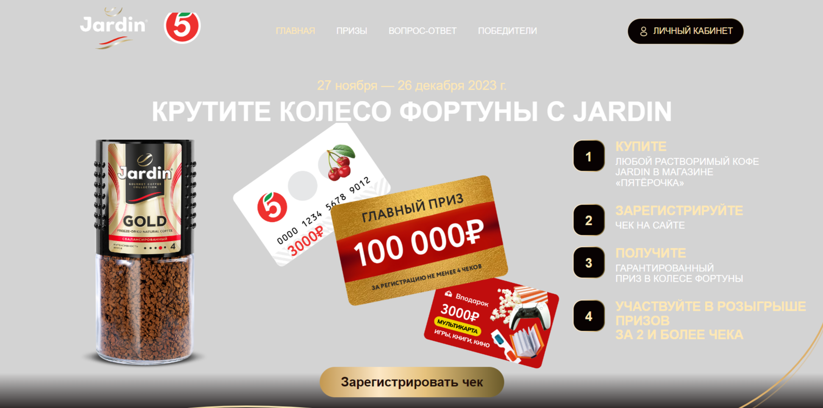 - Купите любой растворимый кофе Jardin в магазине «Пятёрочка»;