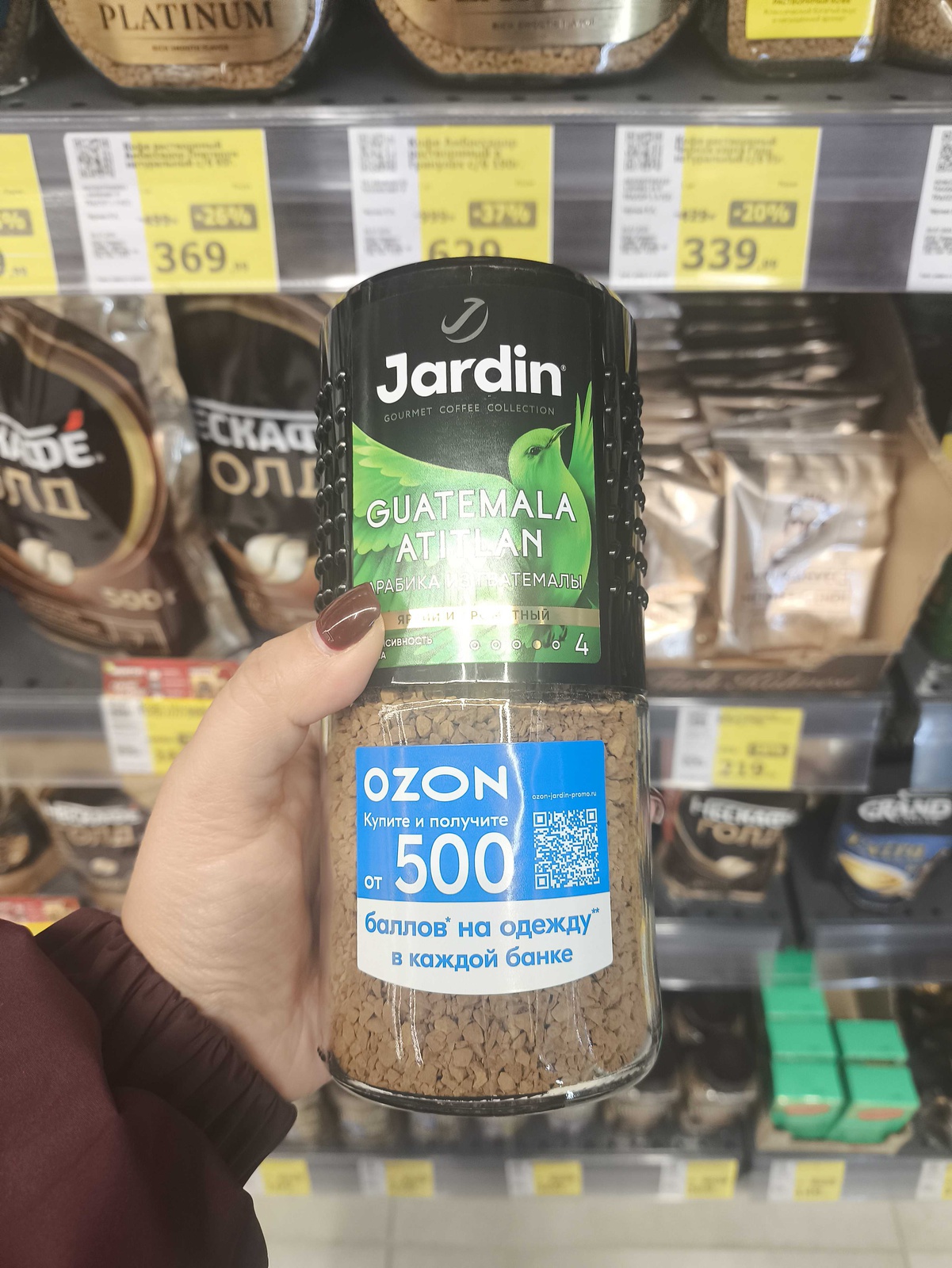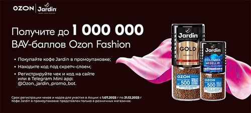 Покупайте кофе Jardin в промоупаковке, находите код под скретч-слоем, регистрируйте чек и код, получите до 1 000 000 ВАУ-баллов Ozon Fashion.