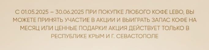 Покупайте кофе Lebo и получайте подарки! При покупке любого кофе Lebo, вы можете принять участие в акции и выиграть запас кофе на месяц или ценные подарки!
