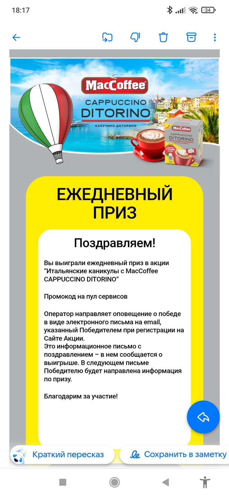 С 15 марта 2026 года участвуйте в акции от кофе MacCoffee. Покупайте продукцию MacCoffee в промо-упаковке, найдите код внутри упаковке и зарегистрируйте, получите гарантированный приз и получите возможность выиграть главный приз - путешествие в Италию и другие призы.