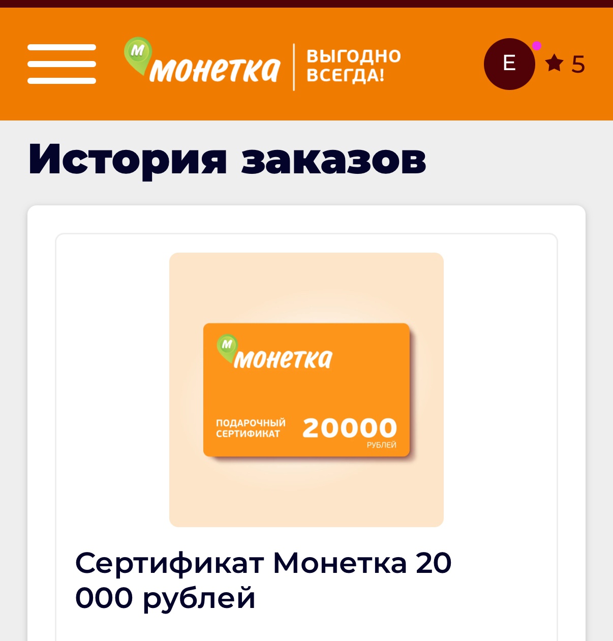 - Сертификат «Монетка» 20 000 рублей - 5 шт.