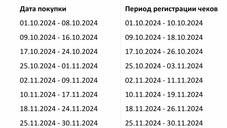 - Срок совершения покупки: с 01.10.2024 г. по 30.11.2024 г.