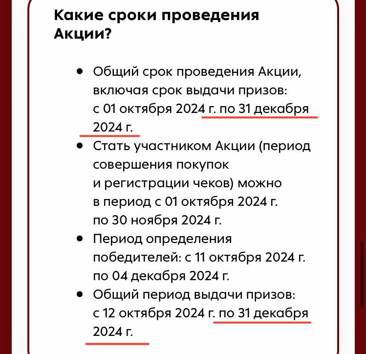 - Общий срок проведения акции: с 01.10.2024 г. по 31.12.2024 г. включая выдачу призов;