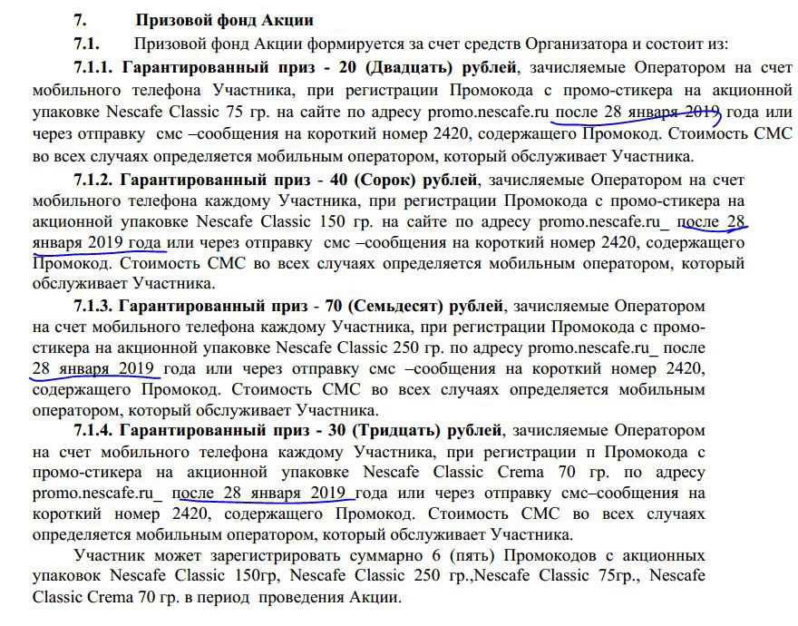 Гарантированный приз - 20 (Двадцать) рублей, зачисляемые Оператором на счет мобильного телефона Участника, при регистрации Промокода с акционной упаковки Nescafe Classic 75 гр.