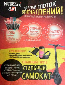 С 22 мая 2019 года участвуй в акции от Nescafe. Купите любые 6 штук Nescafe 3в1 в сети магазинов Магнит, отправьте фото чека и выигрывайте призы!