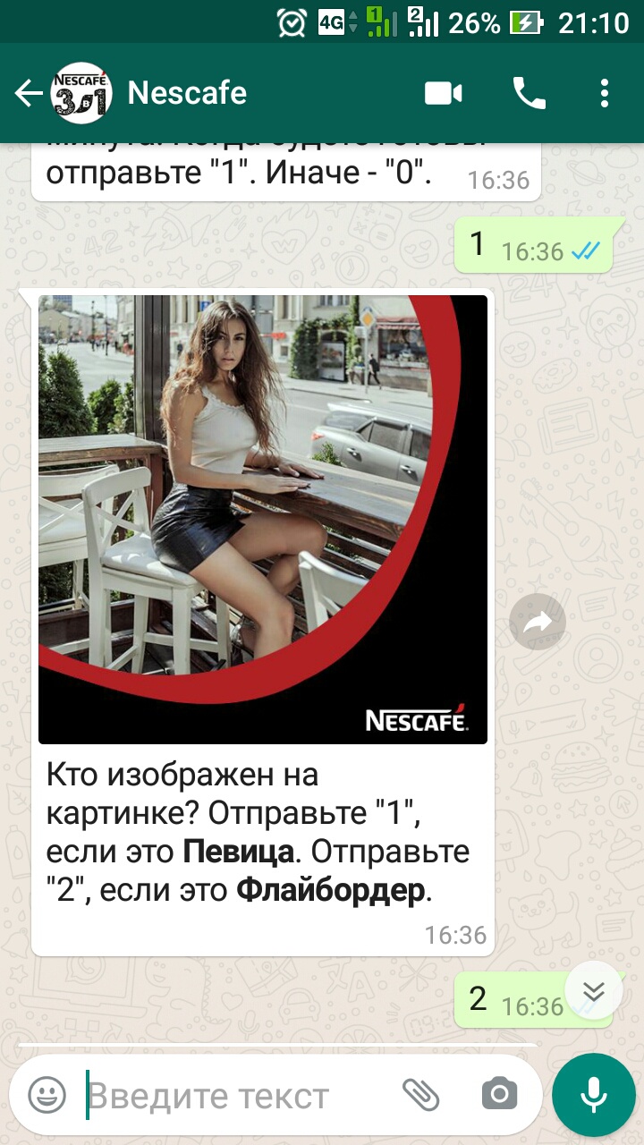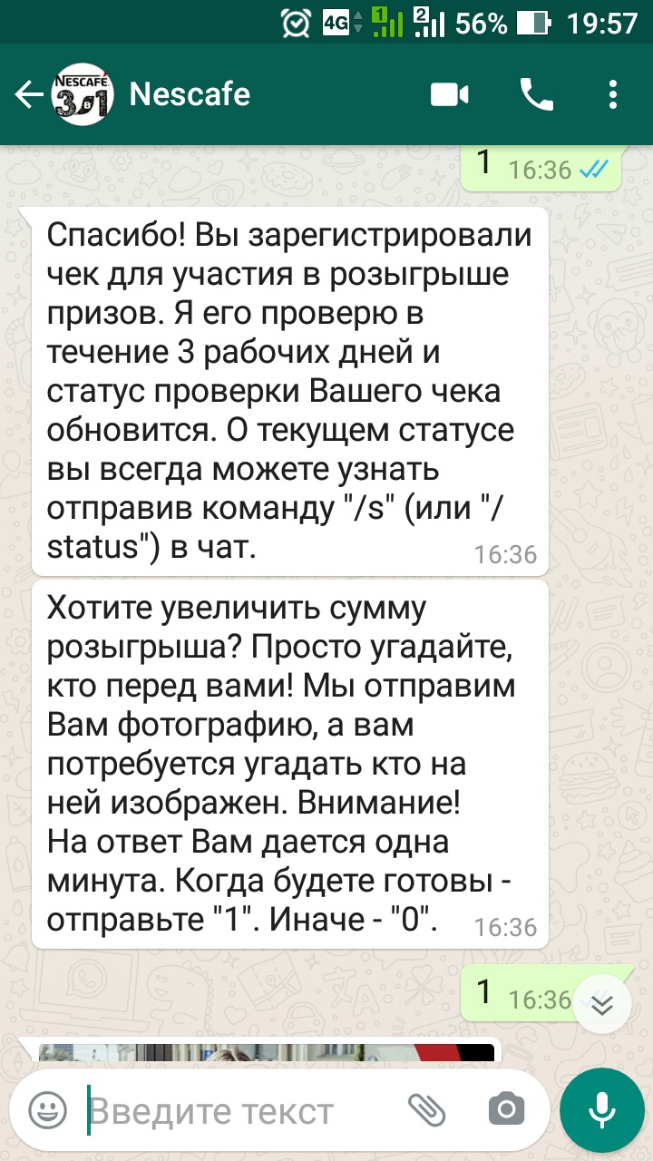 - После загрузки чека участнику будет выслано изображение «персонажа» и два варианта ответа. Участнику необходимо в ответном сообщении указать вариант ответа, который он считает верным по отношению к изображению. Если участник выбрал верный вариант ответа – попадает в базу розыгрыша еженедельных призов №2. Если не верный – в базу розыгрыша еженедельных призов №1. При этом розыгрыш главного приза происходит по общей базе участников.