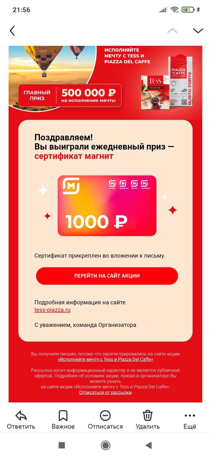 С 17 сентября 2025 года участвуйте в акции от чая Tess и кофе Piazza Del Caffe. Покупайте продукцию, участвующую в акции, в магазинах «Магнит», регистрируйте чек, получите возможность выиграть 500 000 рублей на исполнение мечты и другие призы.
