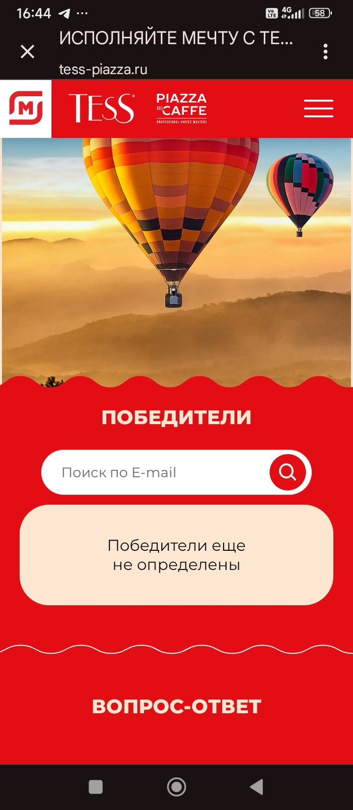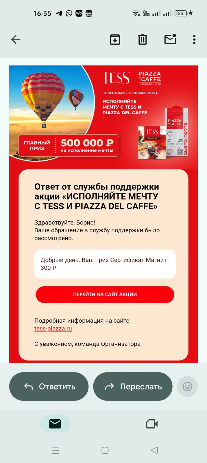 С 17 сентября 2025 года участвуйте в акции от чая Tess и кофе Piazza Del Caffe. Покупайте продукцию, участвующую в акции, в магазинах «Магнит», регистрируйте чек, получите возможность выиграть 500 000 рублей на исполнение мечты и другие призы.