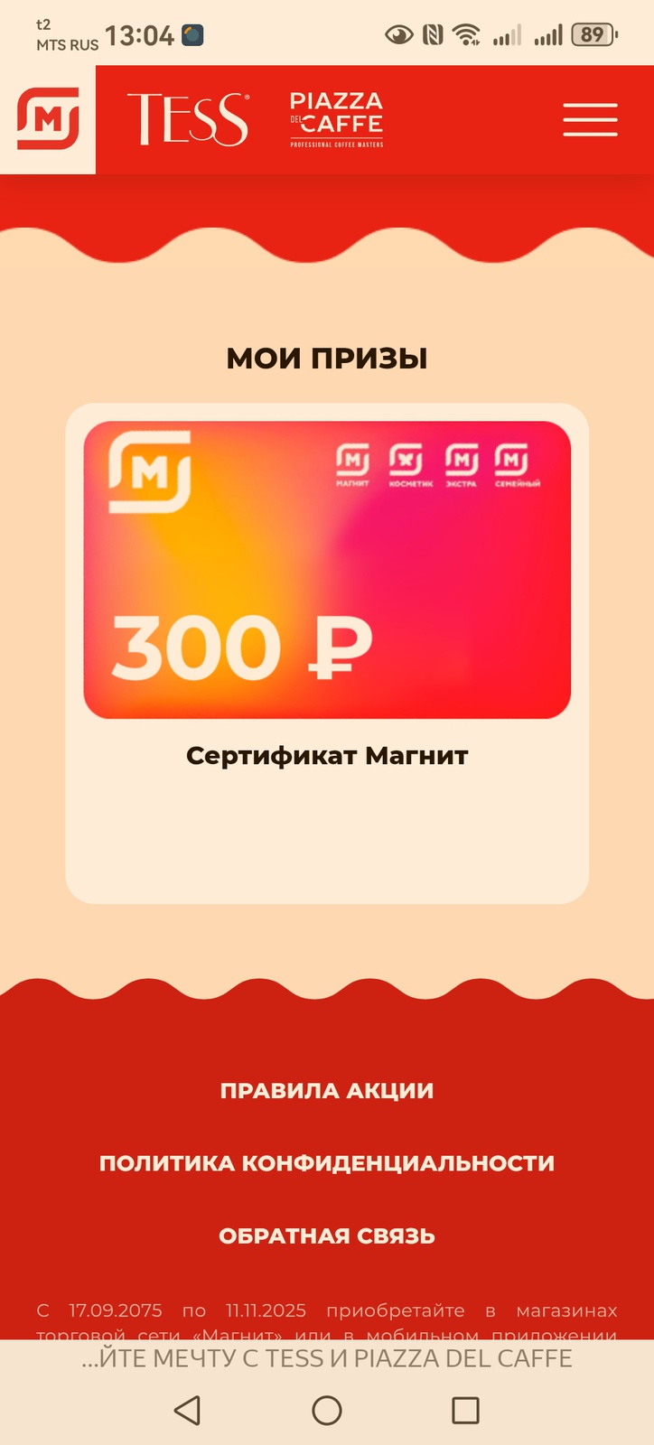 - Розыгрыш главного приза проводится среди тех, кто приобрел минимум 1 упаковку чая Tess и минимум 1 упаковку кофе Piazza del Caffe в рамках одного или нескольких чеков в сети «Магнит» в период покупки товара и регистрации чека;