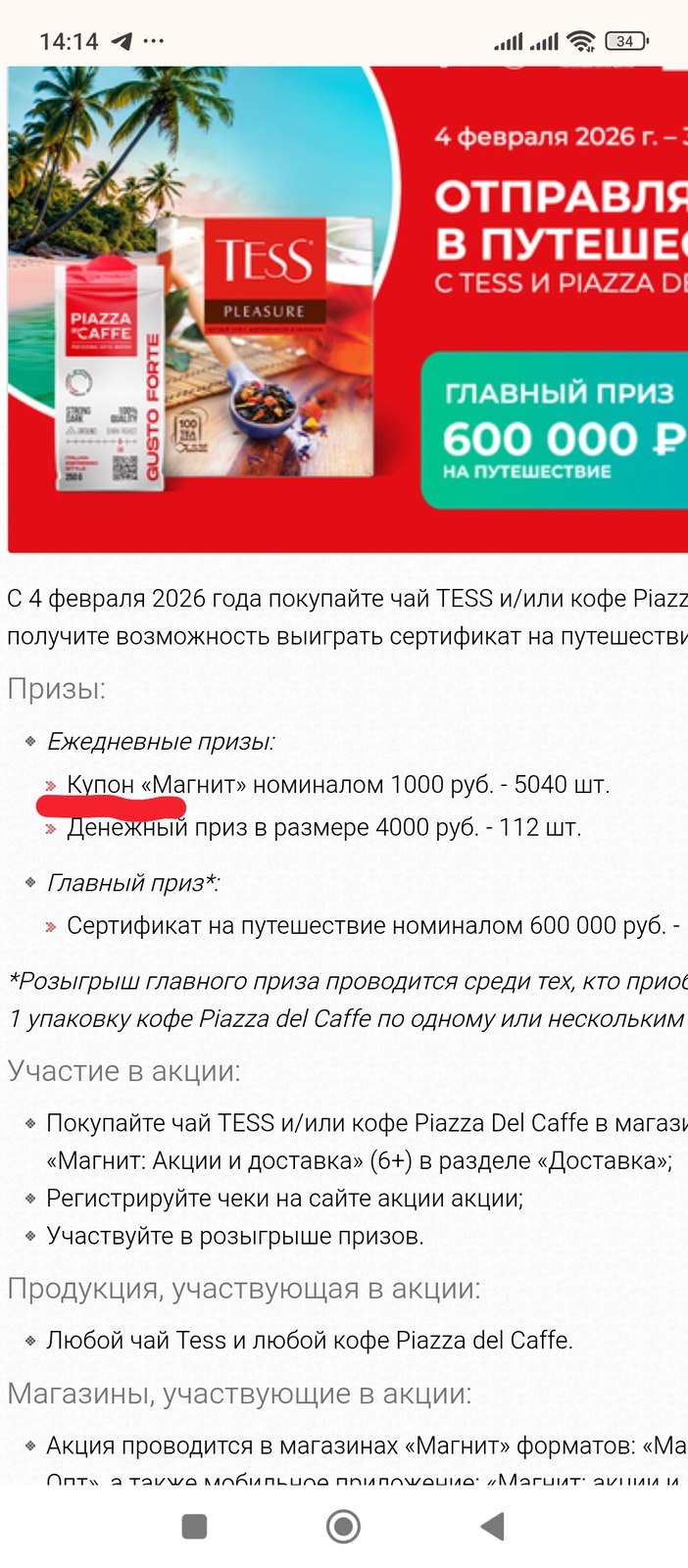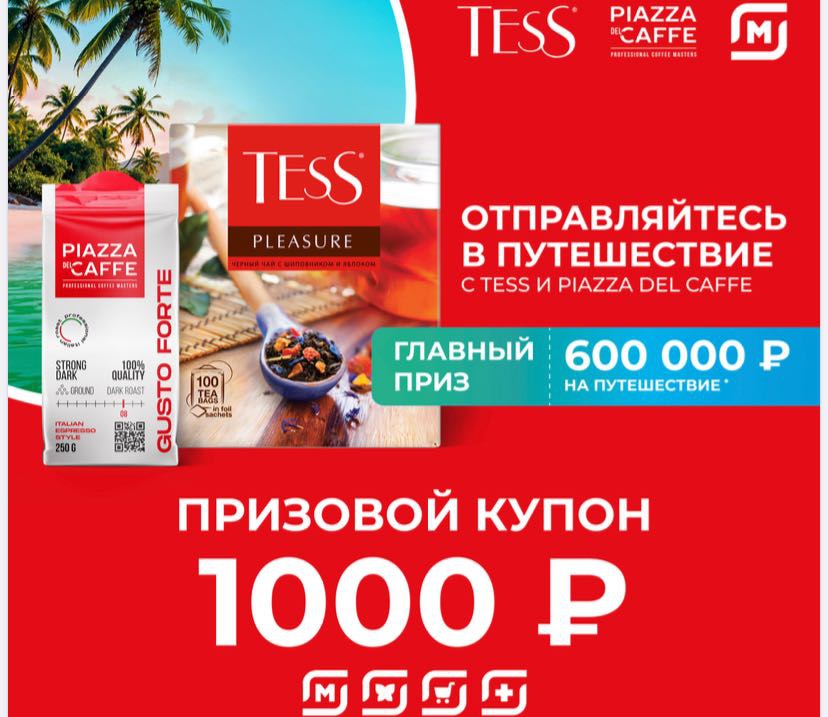 С 4 февраля 2026 года покупайте чай TESS и/или кофе Piazza Del Caffe в магазинах «Магнит», регистрируйте чек, получите возможность выиграть сертификат на путешествие номиналом 600 000 рублей и другие призы.