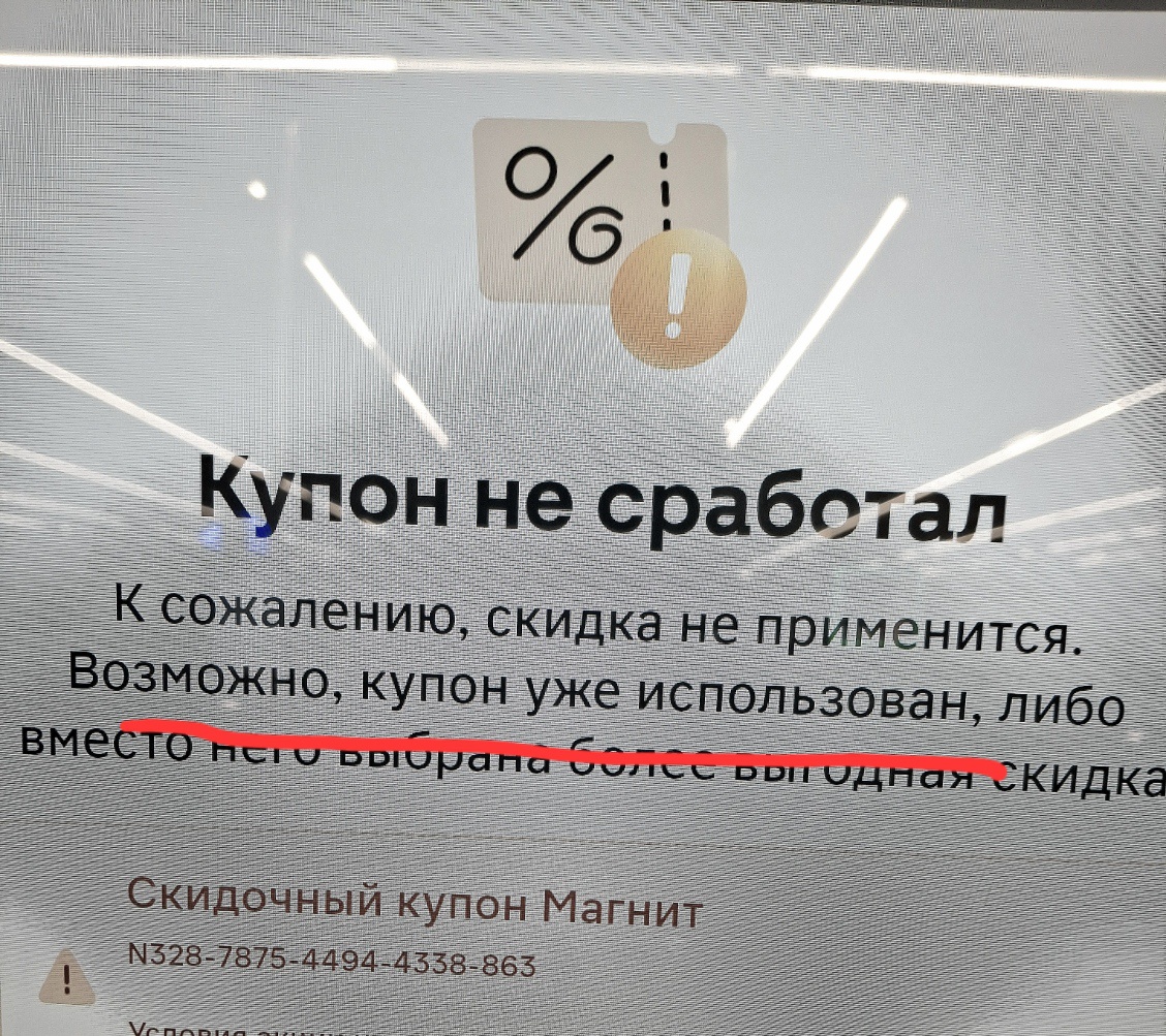 "... По номерам пробиваются только купоны в ЛЕНТУ!!!. По номеру купона в Магните ничего не получится. Только оригинальный штрих код...."