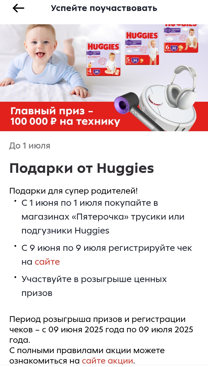 С 1 июня 2025 г. по 9 июля 2025 г. купите трусики или подгузники товарного знака Huggies, зарегистрируйте чек на и участвуйте в розыгрыше призов.