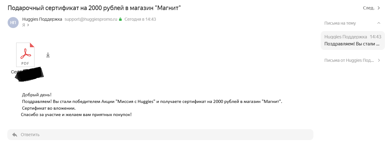 Ответ. Вот такой. Хотя у меня есть в лк зарегистрированный чек, и на шкале прогресса - что я участвую в розыгрыше сертификата на 500 рублей.