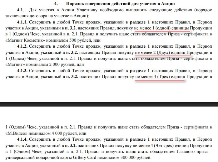 в пункте 4.1.1. написано что бы получить шанс стать обладателем сертификата на 500р нужно совершить покупку НЕ МЕНЕЕ 1 единицы продукции, а это соответственно означает что можно и две, три, четыре и т.д. что бы было так как они выдумали должно быть написано купить 1 единицу продукции