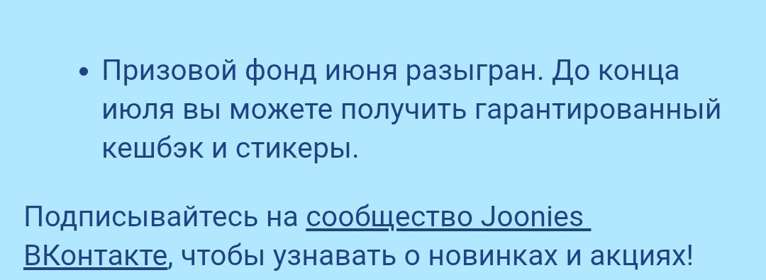 Празднуем день рождения Joonies весь июнь! Кешбэк-вечеринка от Joonies. Попробуйте нежные и надежные продукты Joonies в июне – получите кешбэк 15% и гарантированный приз! В акции участвует вся продукция ТМ Joonies.