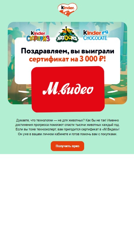 Kinder Сюрприз и Kinder Шоколад приглашают самых отважных и любознательных в мир дикой природы. Изучайте животных из серии Natoons и узнавайте больше интересных фактов о них. А ещё вы сможете выиграть ценные призы и получить гарантированный кешбэк.