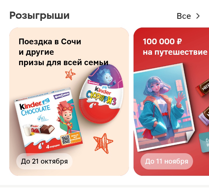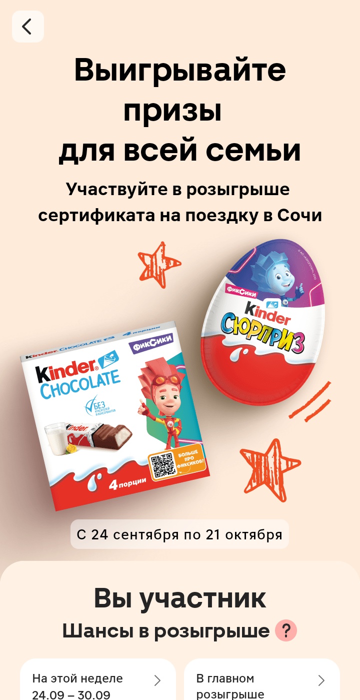 С 24 сентября 2025 года участвуйте в акции от Kinder в магазинах «Магнит». Выигрывайте призы для всей семьи и участвуйте в розыгрыше сертификатов на поездку в Сочи.