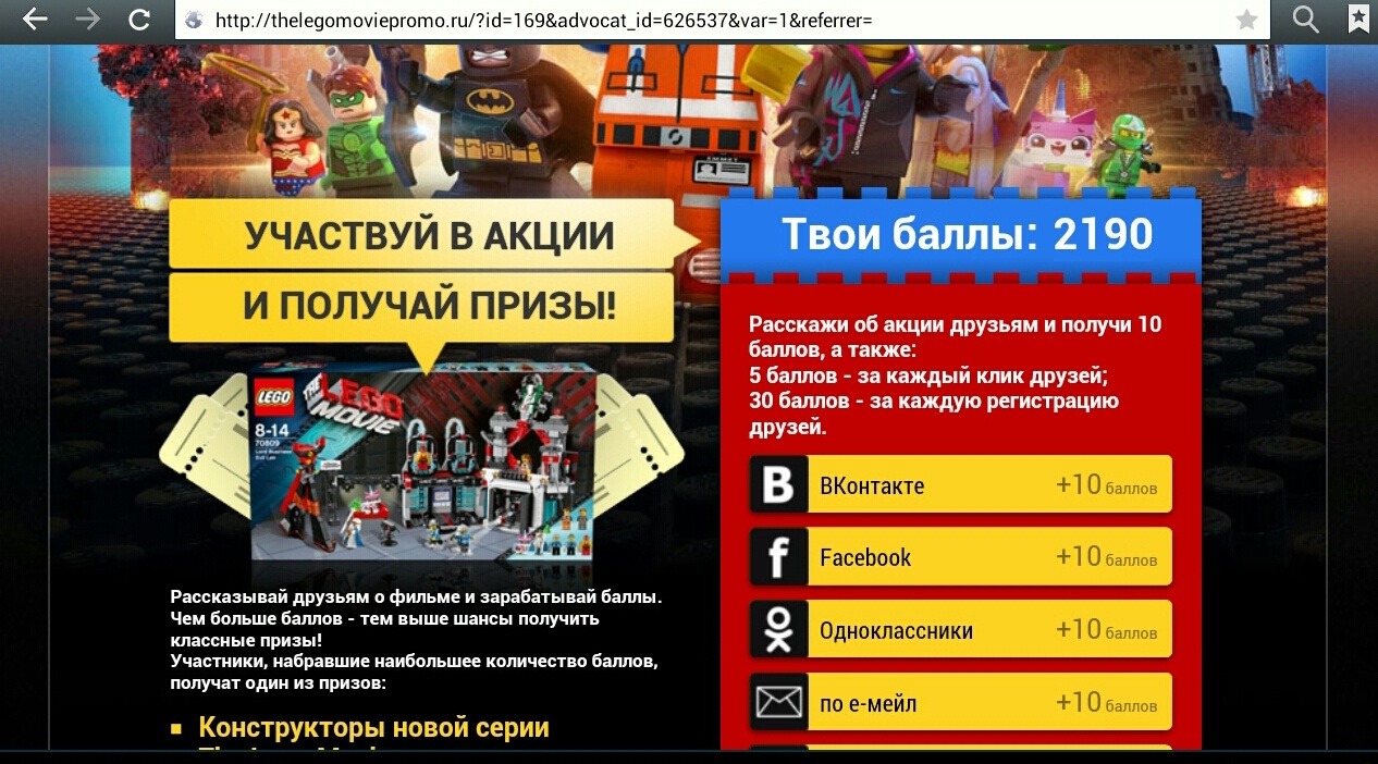 - В период с «18» февраля 2014 по «18» марта 2014 год (включительно) ознакомиться с Правилами Акции и зарегистрироваться на Сайте www.thelegomoviepromo.ru.