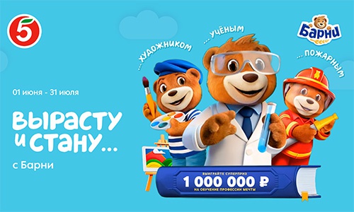 Покупайте бисквит Барни в магазинах «Пятерочка», регистрируйте чек и участвуйте в розыгрыше призов! Получайте гарантированный приз при покупке от 3-х бисквитов Барни.