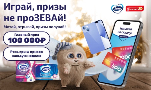 Участвуйте в акции «Играй, призы не прозевай» от компании Zewa. Каждую неделю разыгрываютcя скидки, сертификаты и ценные подарки, а в конце акции главный приз - 100.000 рублей!