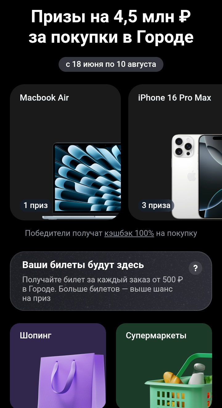 - 3 000 руб. на покупки в Супермаркетах в Городе - 450 шт.;