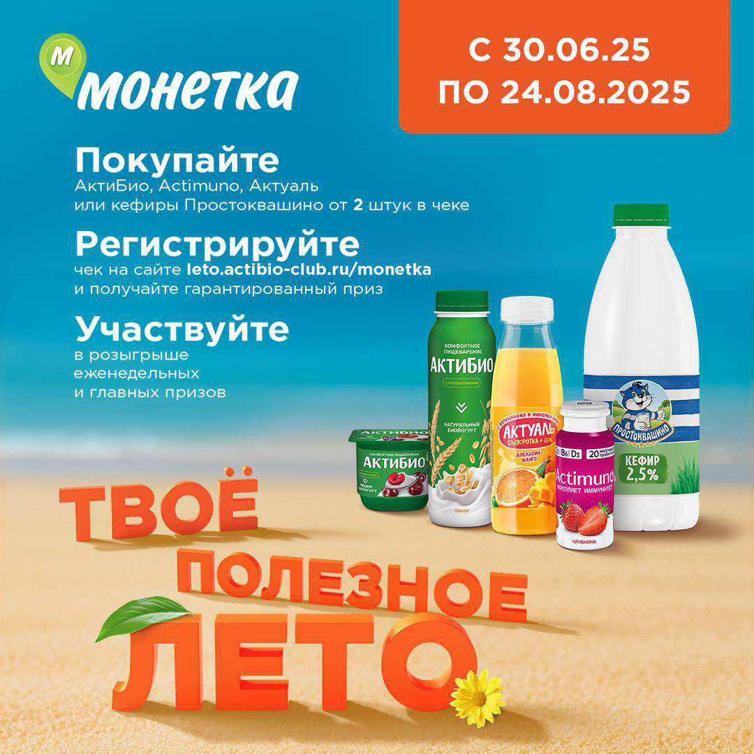 С 30 июня 2025 года участвуйте в акции от «Актибио», «Actimuno», «Актуаль», «Простоквашино», покупайте продукцию, участвующую в акции, регистрируйте чек и выигрывайте призы.