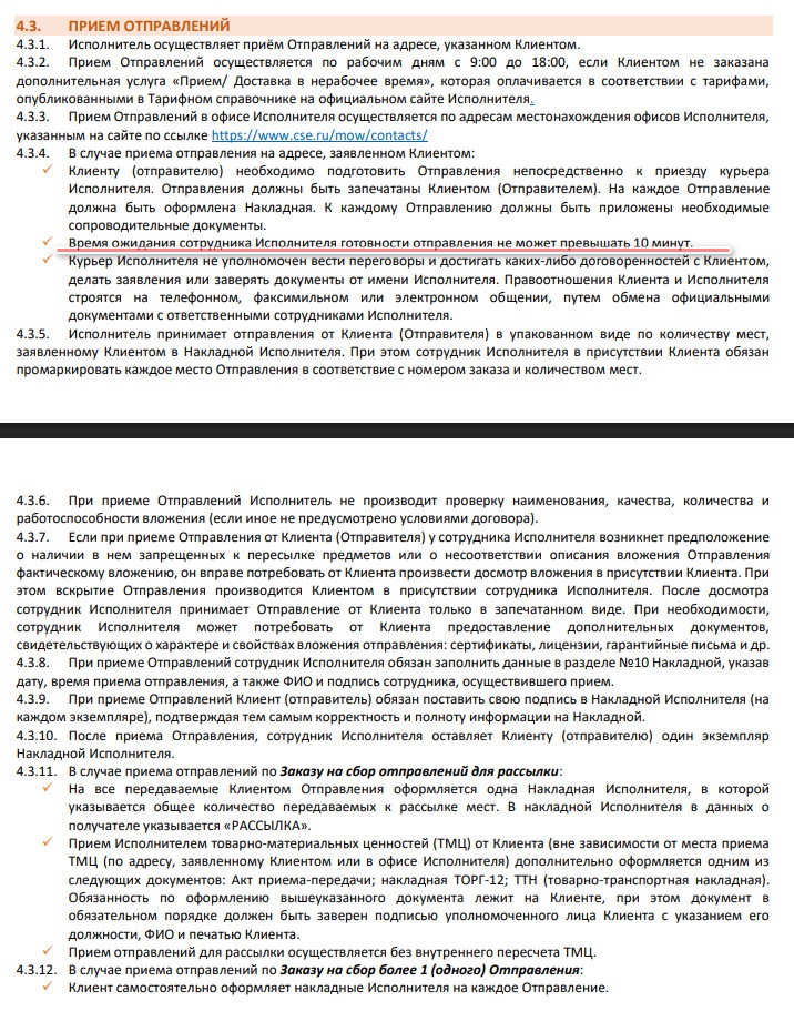 пункт 4.3.4 Время ожидания сотрудника Исполнителя готовности отправления не может превышать 10 минут.