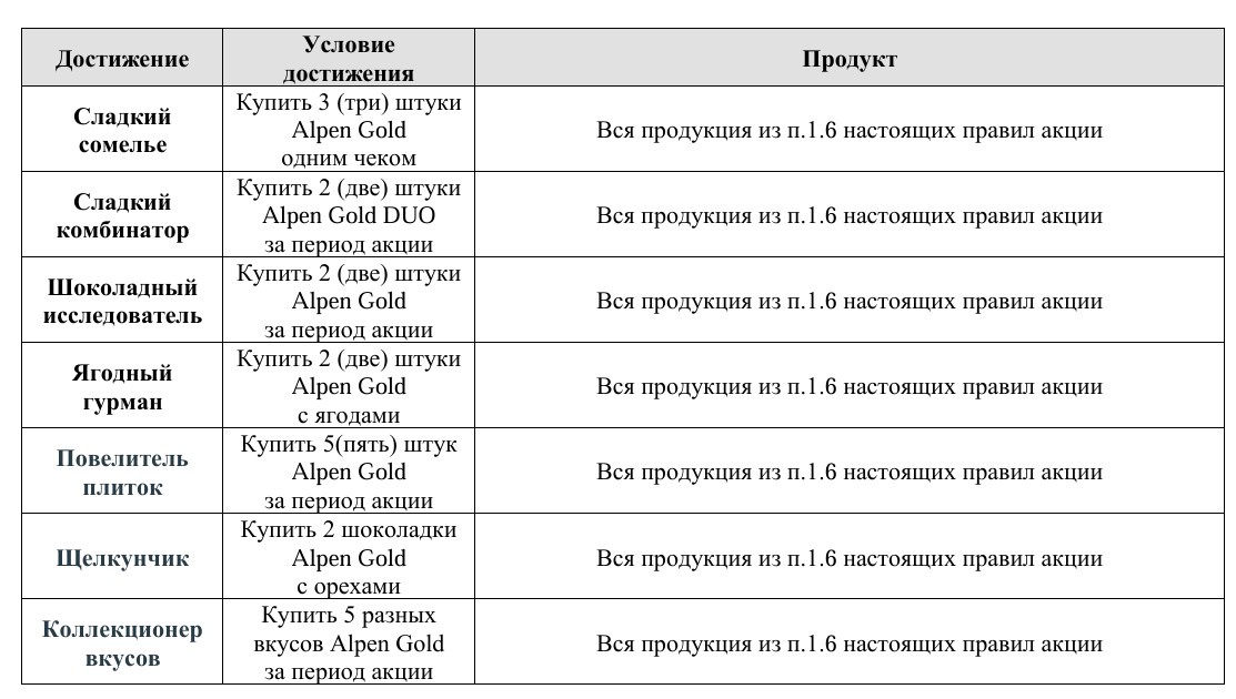 Покупайте продукцию под товарным знаком «Alpen Gold» от 1 штуки в чеке в магазине торговой сети «Пятёрочка» или в сервисе «Пятёрочка доставка» в период с 01 октября 2025 года по 30 ноября 2025 года. Получайте кассовый чек за покупку продукции. Регистрируйте чек в чат-боте в Telegram. Для участия в определении победителей программы достижений необходимо совершить покупку продукции и выполнить любое условие программы достижений.