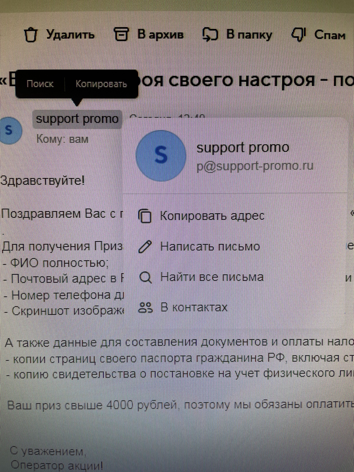 Вы выиграли Сертификат. Для получения приза отправьте электронное письмо на p@support-promo.ru .