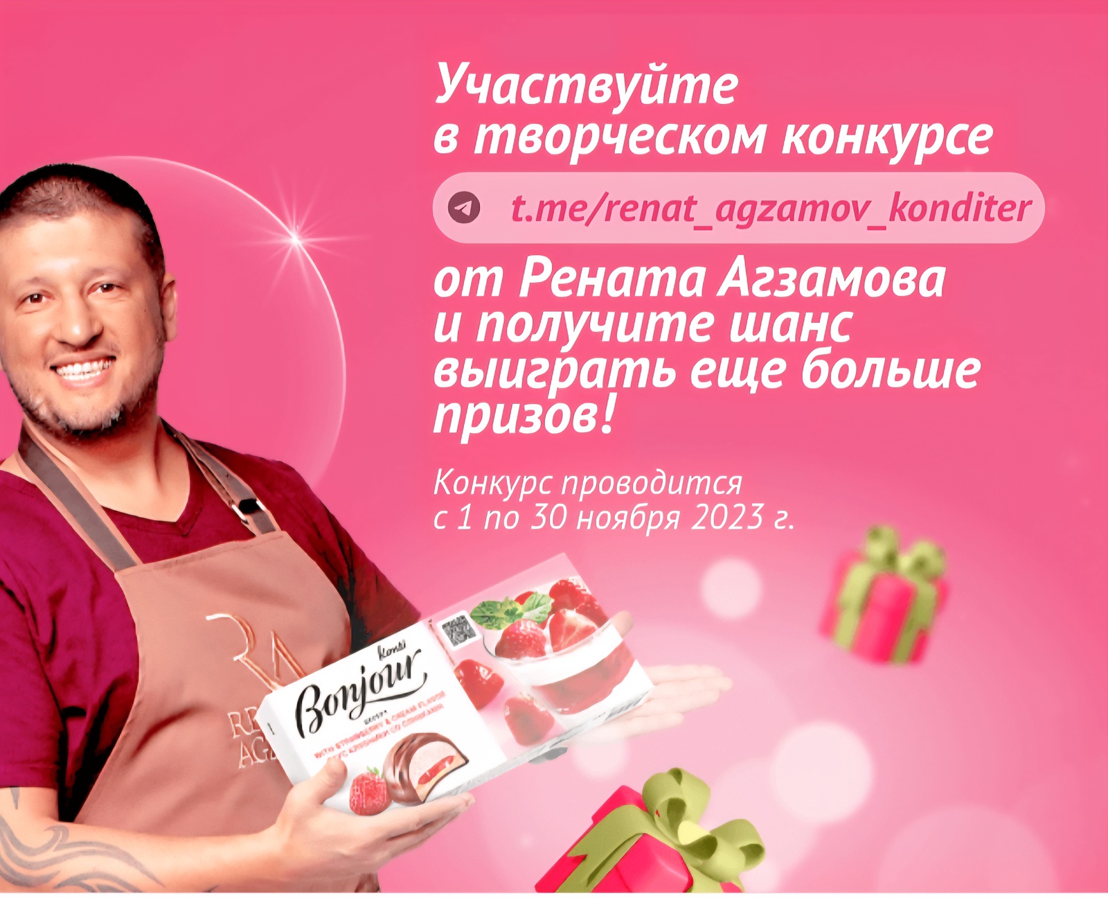 - Bonjour box: сертификат М.Видео на 10 000 руб. + продукция Bonjour + Фартук с автографом Агзамова - 30 шт.