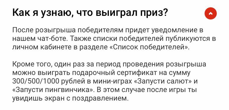 «Один Участник в рамках Акции может получить не более одного приза из указанных в п. 3.1 Правил, за исключением следующего случая: участник, выигравший подарочные электронные сертификаты в Пятерочку, вправе участвовать в розыгрыше главного приза» .