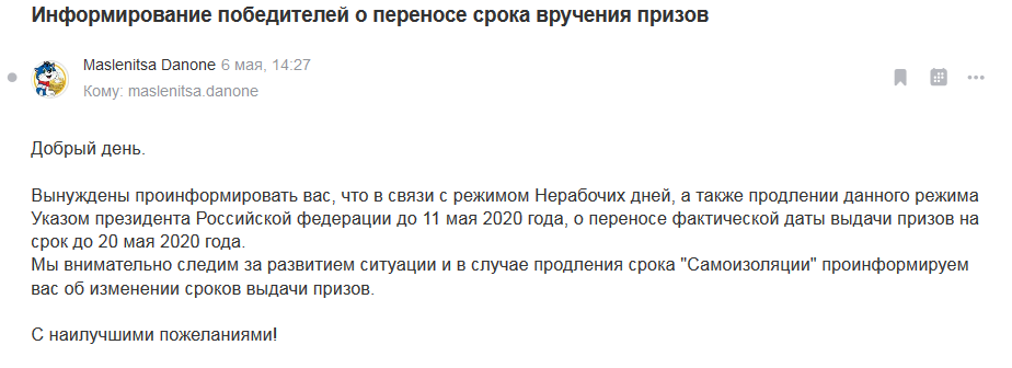 В соответствии с Правилами период выдачи призов продлен до «20» мая 2020 года (включительно).