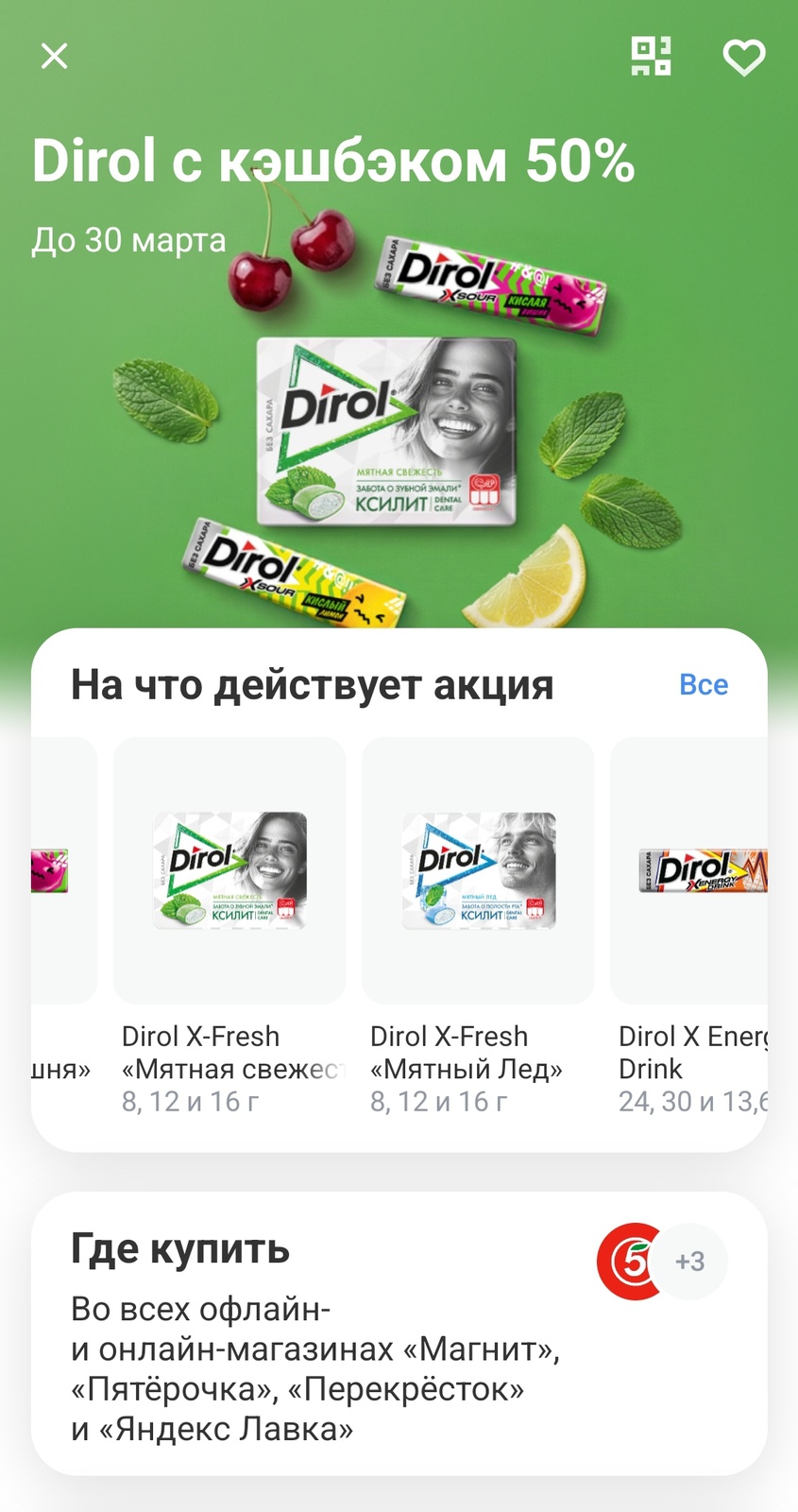 - Покупайте любую продукцию Dirol в ТС «Пятёрочка» и «Перекрёсток»;