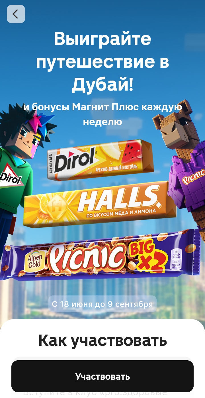 - Покупайте продукцию Dirol, Halls, Picnic в магазинах «Магнит» с использованием карты Магнит Плюс;