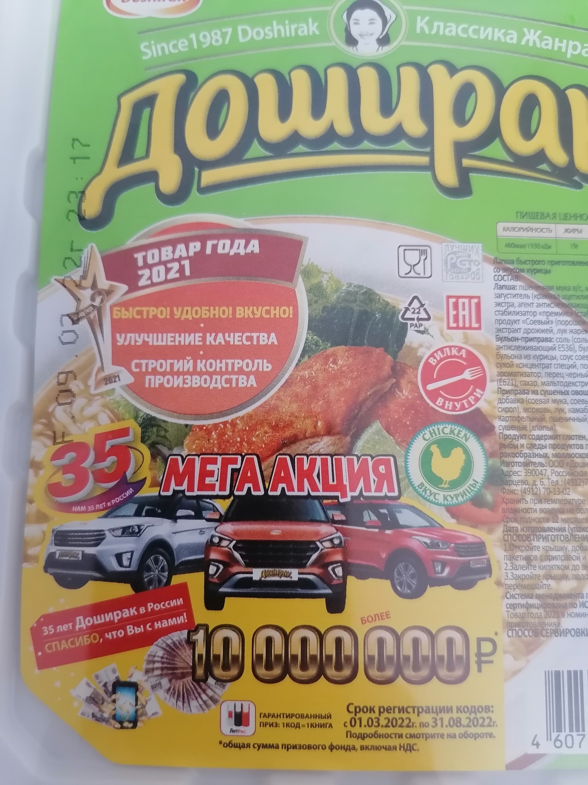 Мега акция! Доширак 35 лет в России! Совершите покупку лапши быстрого приготовления «Доширак», «Доширак Квисти» или картофельного пюре быстрого приготовления «Доширак», найдите уникальный код в упаковке продукции и зарегистрируйте код на сайте. Призовой фонд более 10 000 000 рублей!