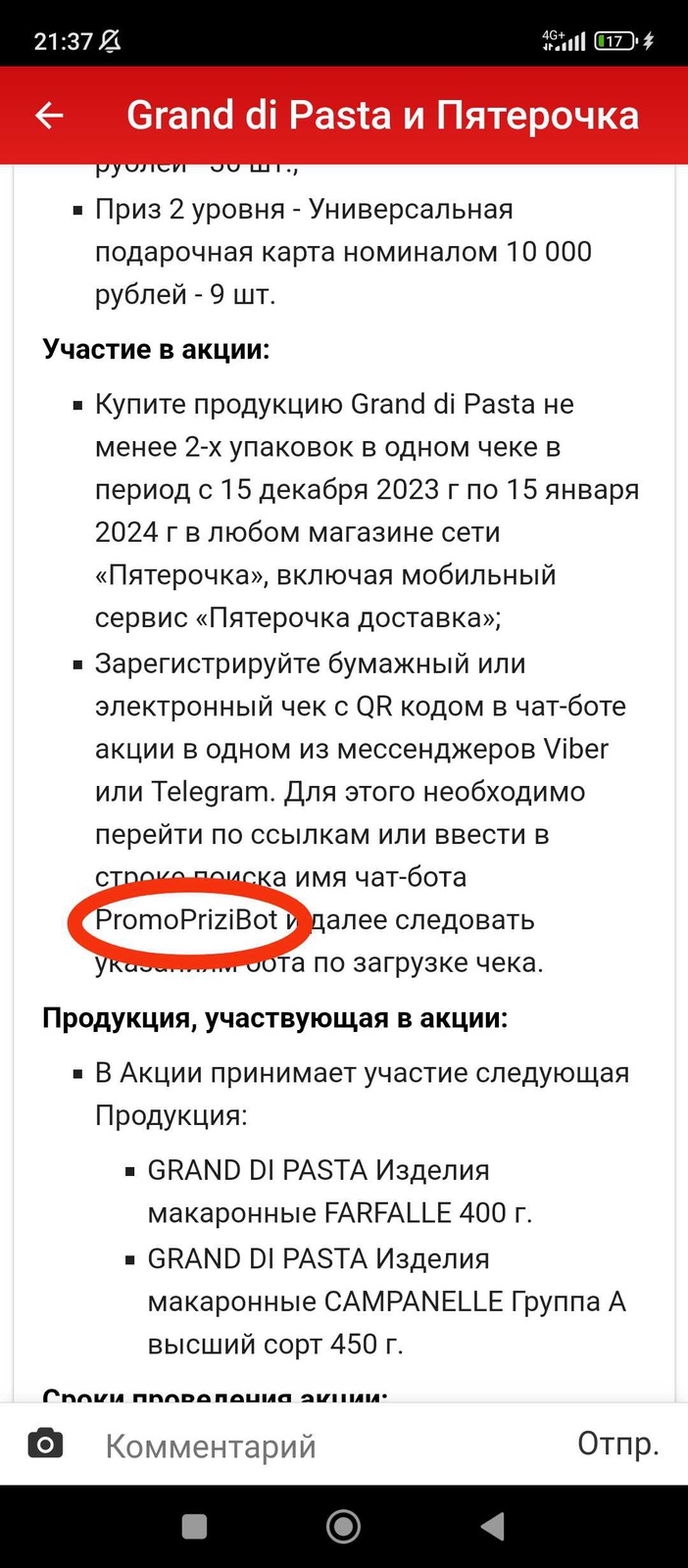 - Купите продукцию Grand di Pasta не менее 2-х упаковок в одном чеке в период с 15 декабря 2023 г по 15 января 2024 г в любом магазине сети «Пятерочка», включая мобильный сервис «Пятерочка доставка»;