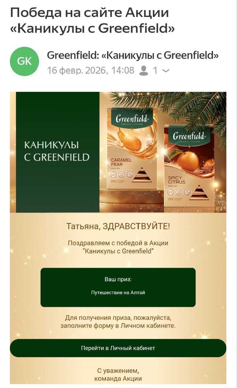 С 1 декабря 2025 года покупайте чай Greenfield в магазинах «Пятерочка», регистрируйте чек, получите стикерпак, участвуйте в розыгрыше путешествия на Камчатку или на Алтай и других призов.