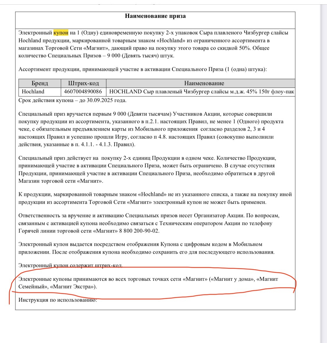 - Электронный купон на 1 единовременную покупку 2-х упаковок Сыра плавленого Чизбургер слайсы Hochland со скидкой 50%. Общее количество Специальных Призов – 9 000 шт.