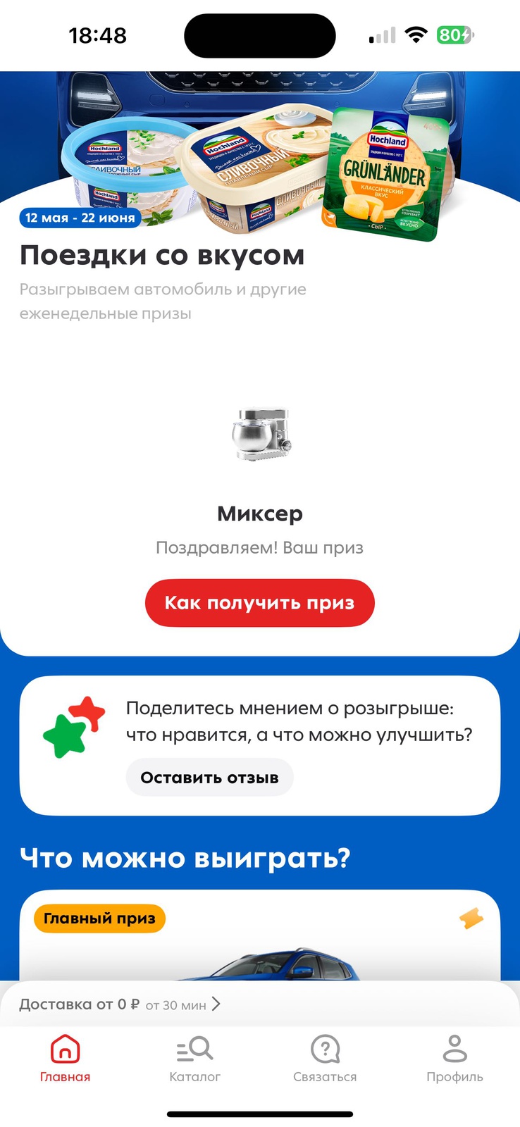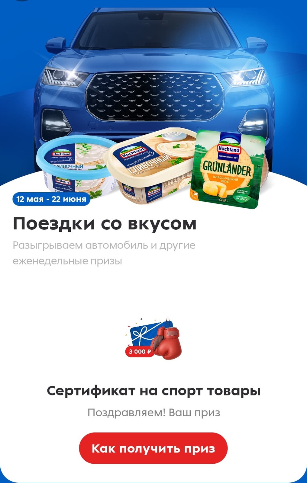 - Покупайте продукты Hochland в магазинах «Пятёрочка» с использованием карты лояльности или заказывайте их в доставке с 5 мая по 15 июня 2025г.;
