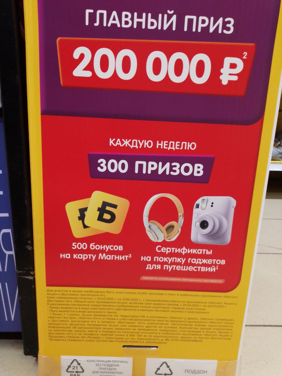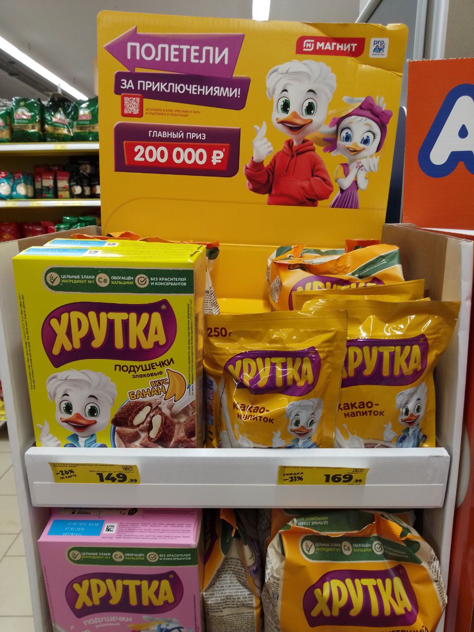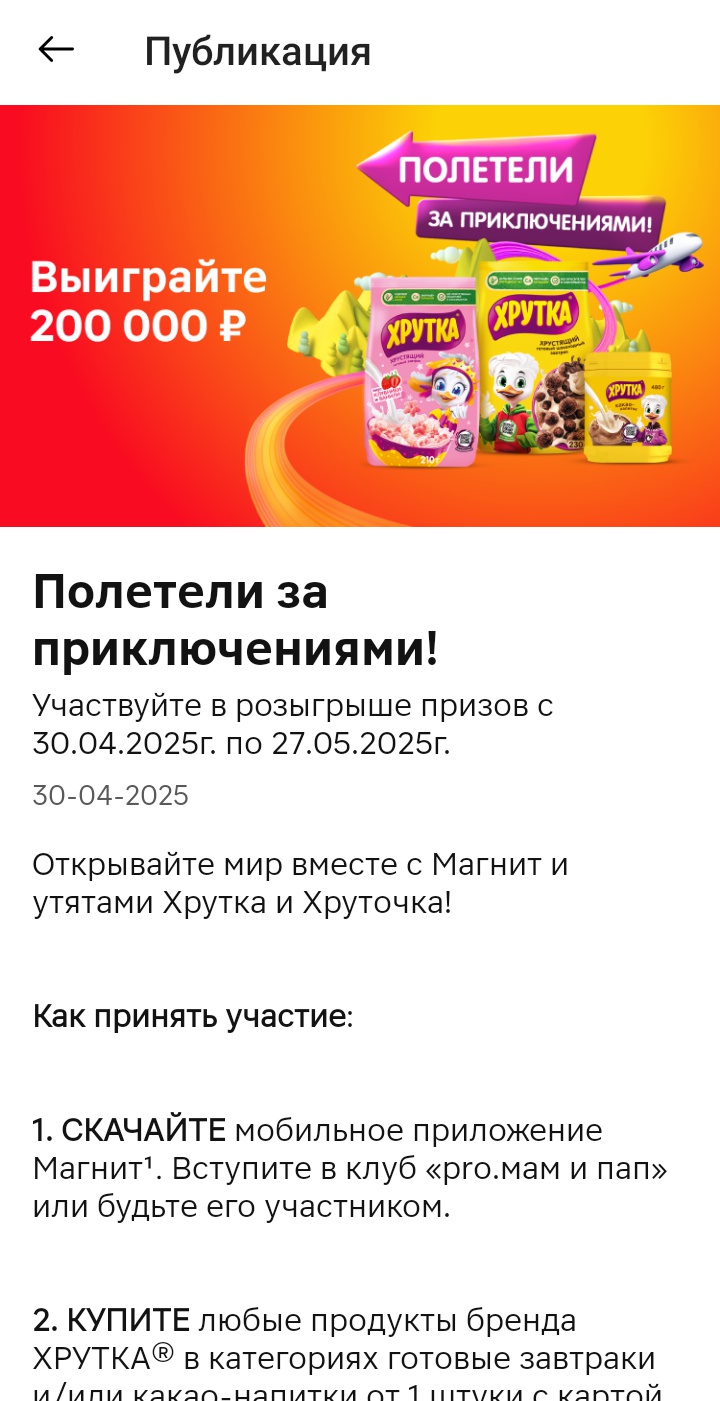 - Купите любые продукты бренда Хрутка® в категориях готовые завтраки и/или какао-напитки от 1 штуки с картой из приложения Магнит в период с 30 апреля 2025 г. по 27 мая 2025 г.;