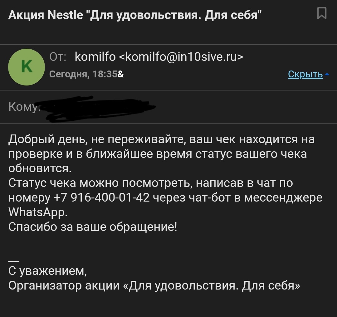 Статус чека можно посмотреть, написав в чат по номеру +7 916-400-01-42 через чат-бот в мессенджере WhatsApp.".