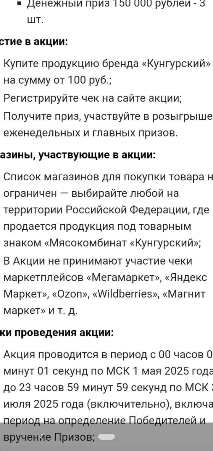 - В Акции не принимают участие чеки маркетплейсов «Мегамаркет», «Яндекс Маркет», «Ozon», «Wildberries», «Магнит маркет» и т. д.
