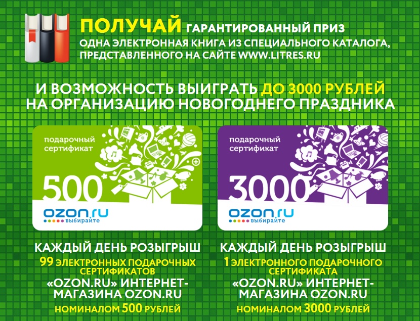 - Каждый день розыгрыш 99 электронных подарочных сертификатов OZON.ru на 500 руб.;